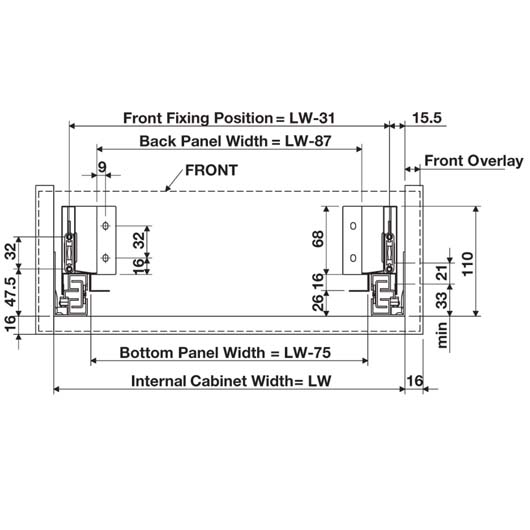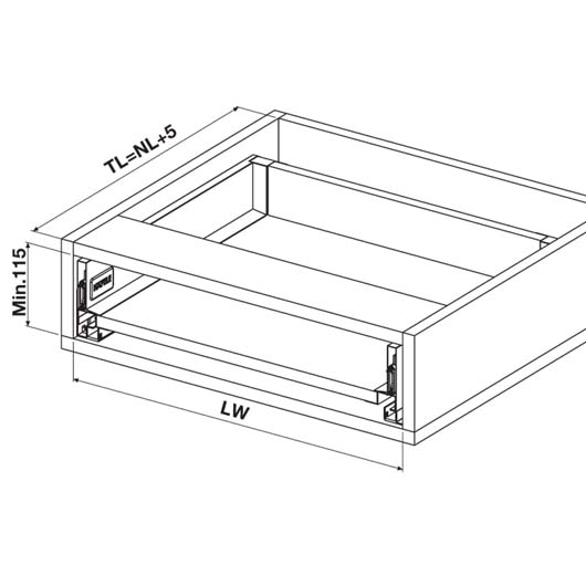 Standard drawer suits 16 mm drawer base and rear panel