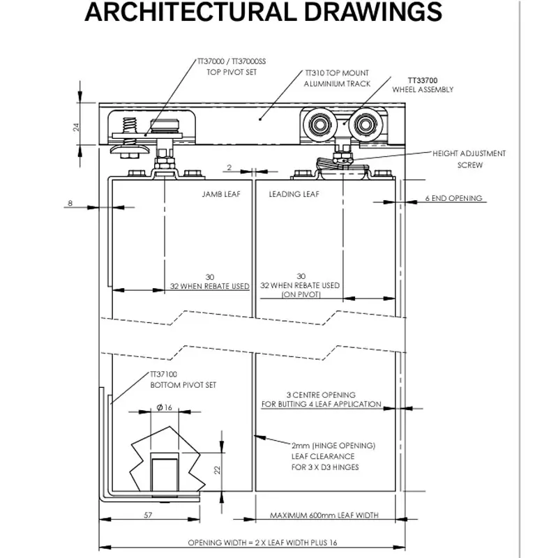 Thrust bearing on jamb door pivot ensures ease of operation High strength height adjusting pivot