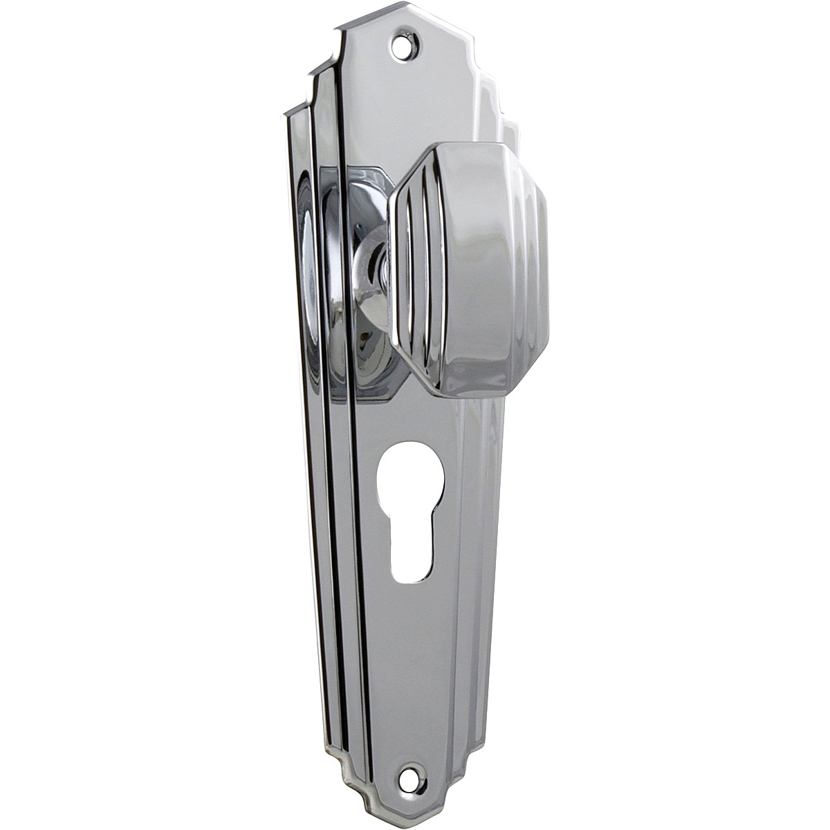 Tradco 1090E Door Knob Elwood Art Deco Euro Chrome Plated H200xW63xP47mm. Supplied as a set, to furnish the both sides of the door.