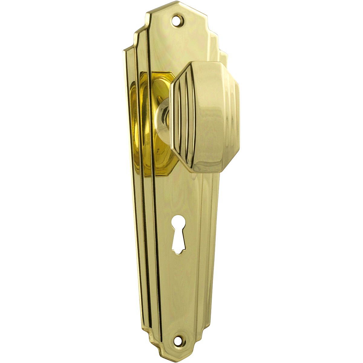 Tradco 1071 Door Knob Elwood Art Deco Lock Polished Brass H200xW63xP47mm. Supplied as a set, to furnish the both sides of the door.
