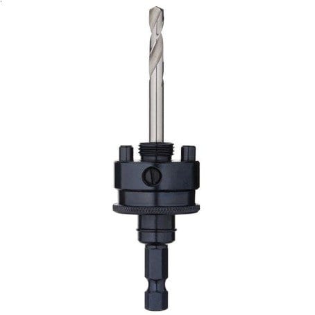 Large Holesaw Arbor To Suit Saws 32mm To 198mm. Dual Drive Pins To Aid Release And Prevent Binding. Quick Release Hex Shank Suits 10mm Chucks