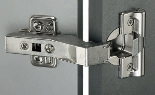 The hinge is fastened to the door with screws. Usually 3.5 x16mm (6g x 5/8)